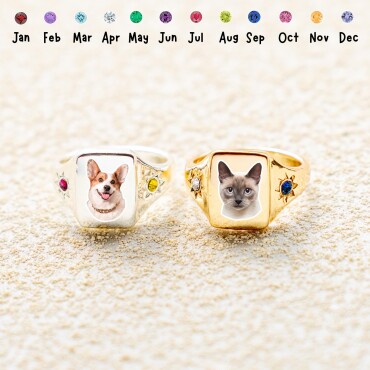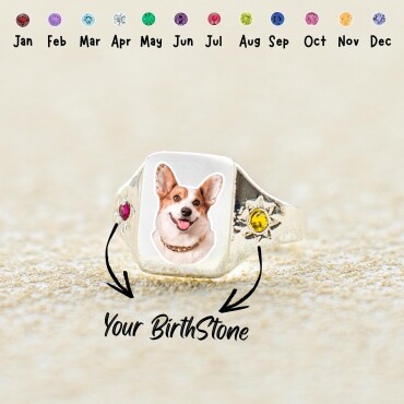 Custom Pet Birthstone Ring Pet Portrait Photo Gemstone Ring, Dog Cat Memorial Jewelry Gift for Pet Lover, Pet Remembrance, Gift for Her