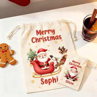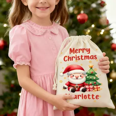 This charming gift bag features an adorable Santa Claus, either relaxing by the Christmas tree or holding a beautifully wrapped gift. With 20 different designs to choose from, the eye-catching "Merry Christmas" message and delightful snowflake embellishments enhance the festive atmosphere. You also have the option to personalize the bag with your name, making it truly unique.