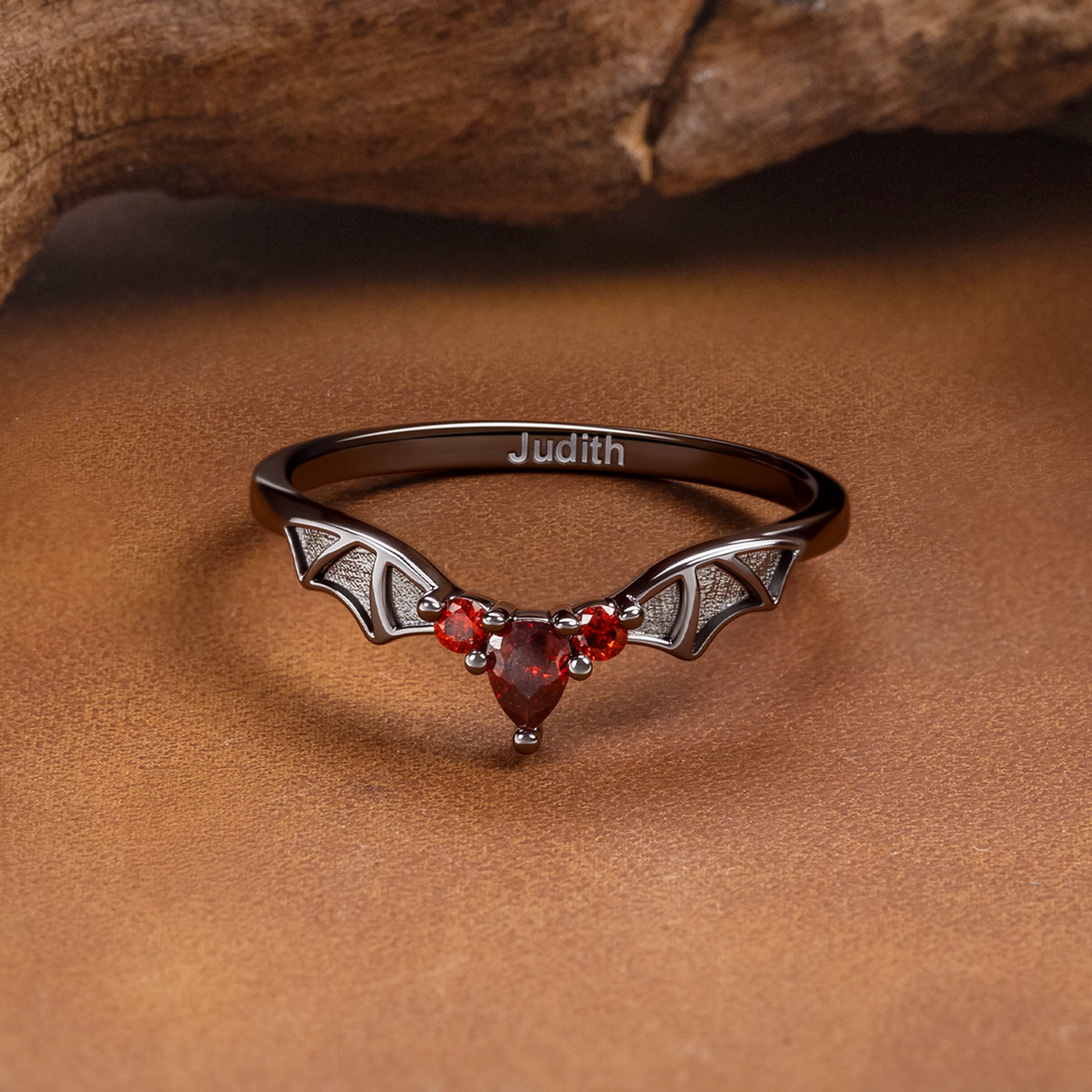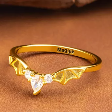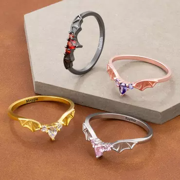 The ring features an intricate bat-wing design encircling the band, exuding a gothic mystique that symbolizes mystery and elegance. Paired with a birthstone exclusive to your birth month, it blends personal attributes with unique style, making the ring a distinctive emblem for bat enthusiasts.