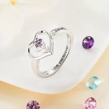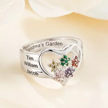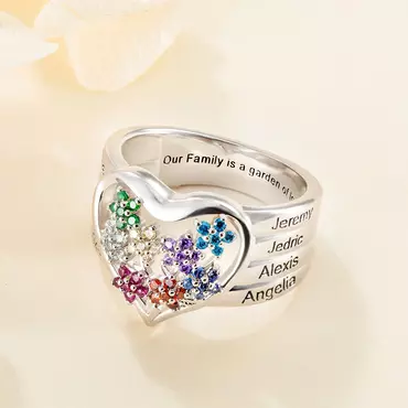 A loving family is always flowering with the joy and beauty of life! Now, you can forever celebrate the uniqueness of each special member of your family with this ring. A beautiful tribute to the deep roots and meaningful union of family, this birthstone and name ring lets you add your own touch. Superbly handcrafted of solid sterling silver or brass. Blooming at the center of the heart is an eye-catching bouquet of some birthstone flowers, each crafted with five birthstone "petals".