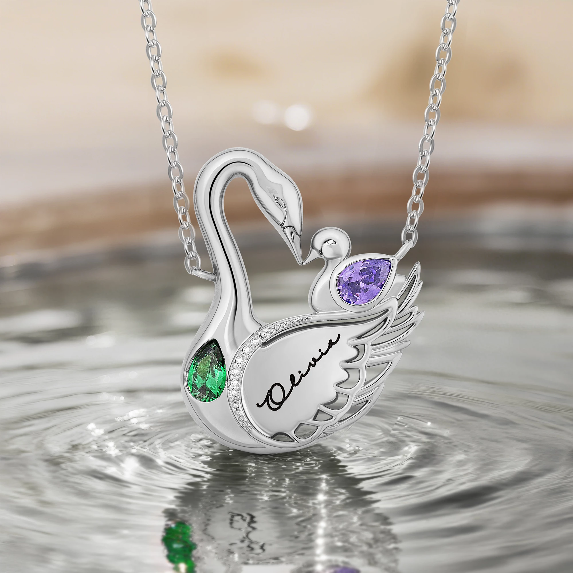 This necklace, inspired by the image of a mother swan protecting her cub, can be paired with a birthstone corresponding to the mother's or baby's birthday. Each birthstone has its own unique color and meaning, adding a personal touch to the necklace while adding a refined touch to the elegant design. A custom card can be added, featuring handwritten wishes for mother or hopes for a new life, perfectly capturing the eternal theme of maternal love.