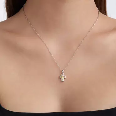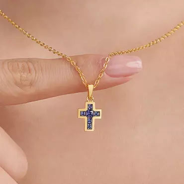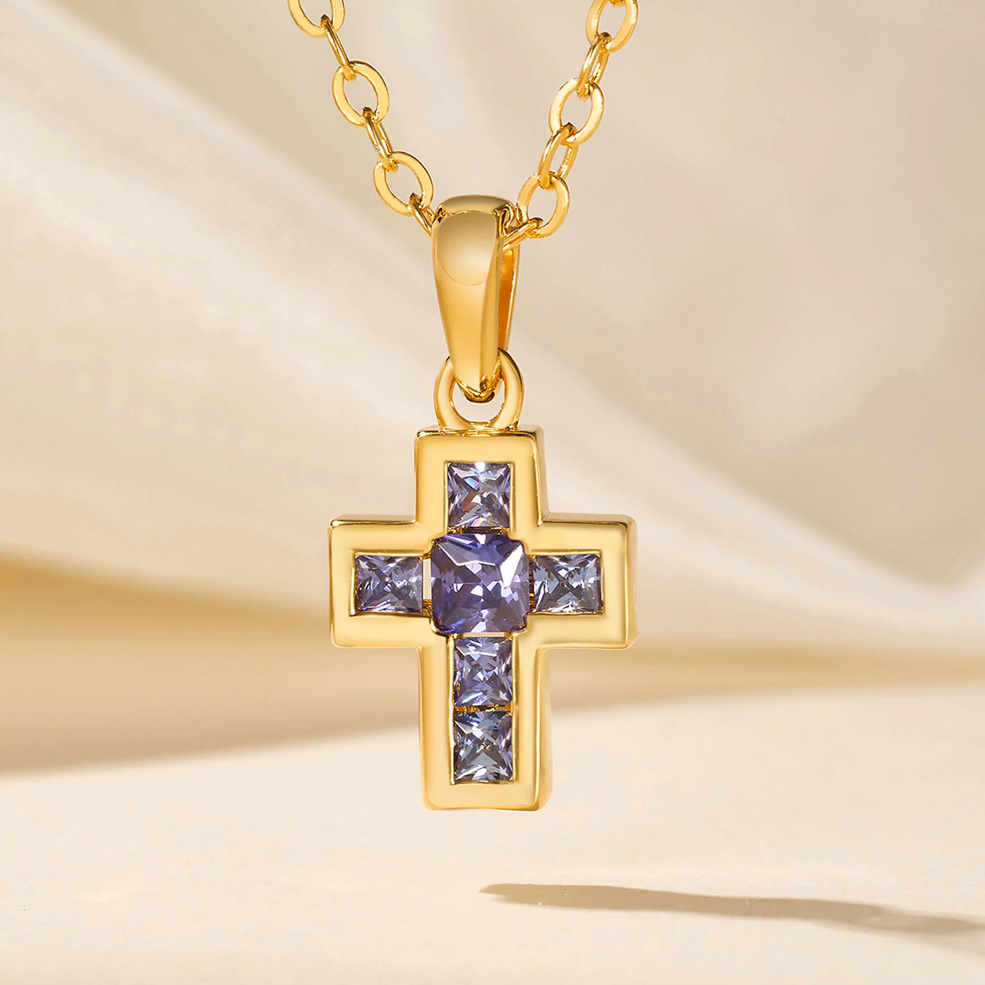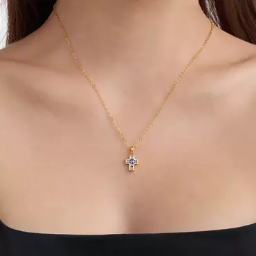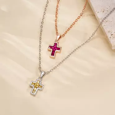 This necklace features a striking, tiny cross design. Each necklace can be decorated with your preferred birthstone, symbolizing the wearer's unique qualities, such as sapphires, symbolizing wisdom and loyalty, and rubies, symbolizing passion and love. Create a necklace that is truly unique to you.